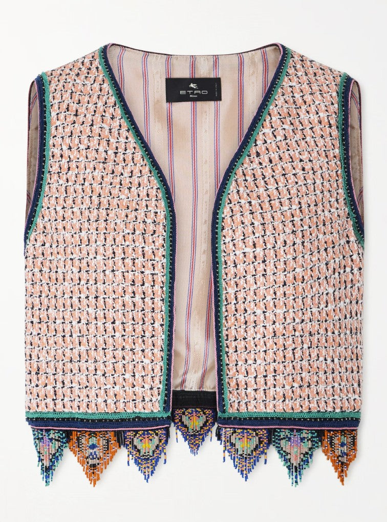 Cropped Jacquard waistcoat with tweed effect, fringing and check motif