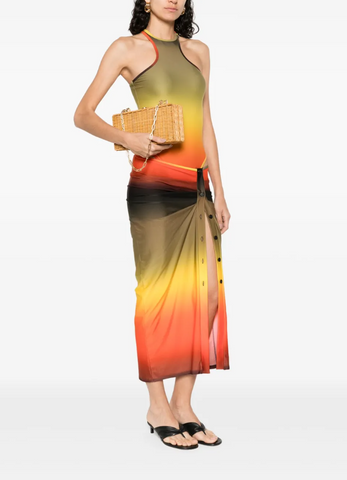 A whimsical rattan clutch that doubles as a portable game of backgammon when opened up.